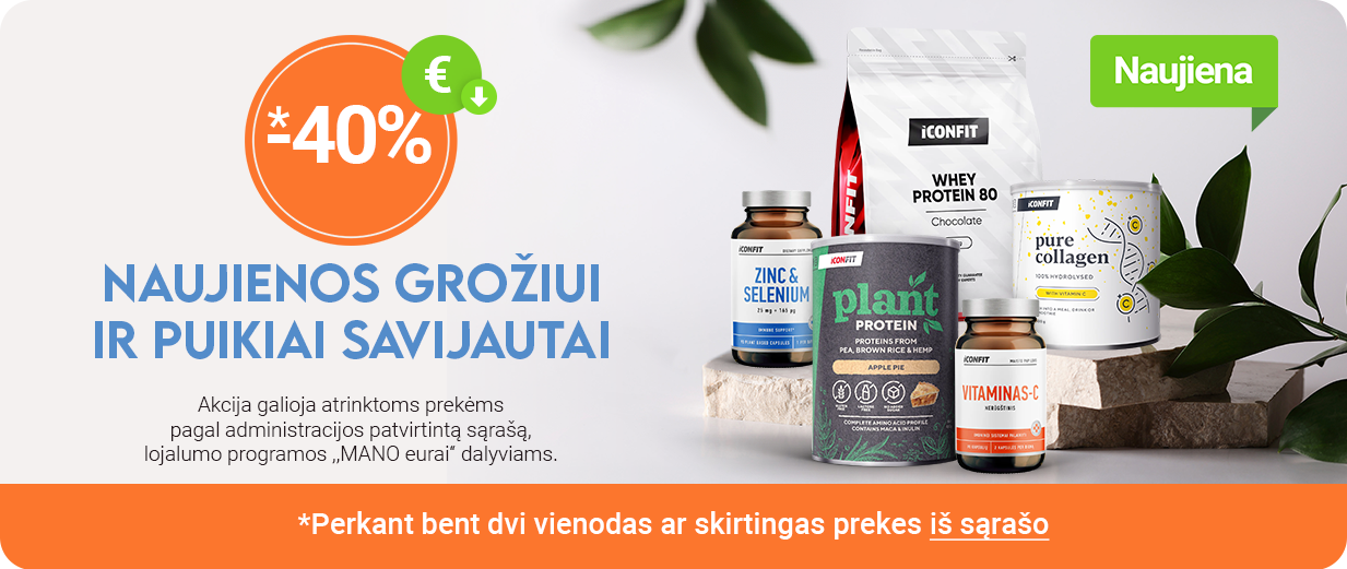 Užsisakę bent dvi naujųjų papildų ICONFIT pakuotes (skirtingas ar vienodas), visoms gausite oranžinę nuolaidą net -40%!